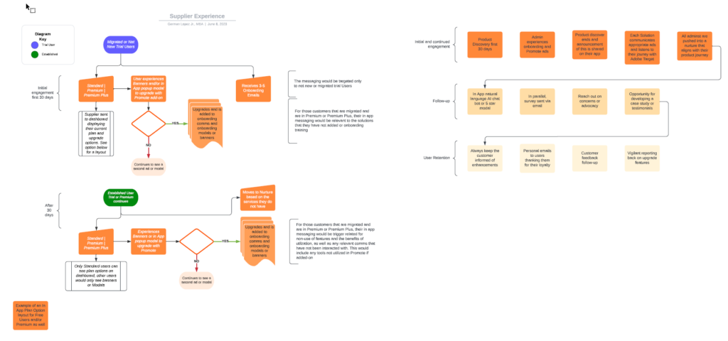 Action: In collaboration with stakeholders responsible for reviewing my recommendations prior to presenting to the C-suite. I began with revising the SaaS UI through developer tools in Chrome and adding the new product availability visuals and banners that would appear once a user logged into their current account or registered as a new user. I also built two customer journey flowchart programs, one for a 30-day free user registration onboarding journey, and for current members. Then I built out an upsell opportunity nurture as well to promote to those that are current members. I created a communication plan for when distributions would occur. I also built a loyalty program to gamify utilization of the entire Business Network solution to build brand awareness and advocacy of the network without creating another outflow of spend. This was all mapped out utilizing flowcharts in a complex manner. Once my stakeholder approved my recommendations, I then simplified the flow charts in a manner that the C-suite can quickly digest and created a presentation sharing my recommendations. My stakeholder combined my assets with her presentation to complete the conversation. One important finding during research and required risk mitigation was admins vs. users. Because of my findings the launch date had to be moved to 2025.